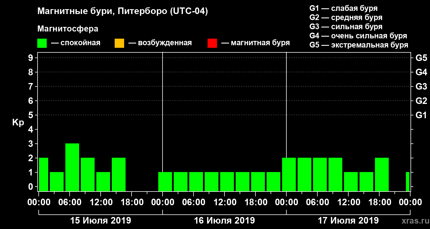 Изменения геомагнитного индекса Kp с 15 по 17 июля 2019 года для средних широт