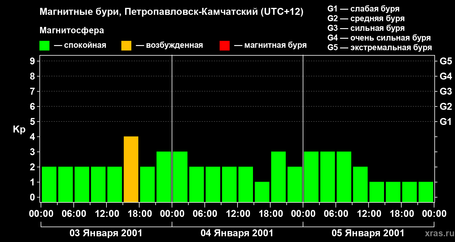 Изменения геомагнитного индекса Kp с 3 по 5 января 2001 года для средних широт