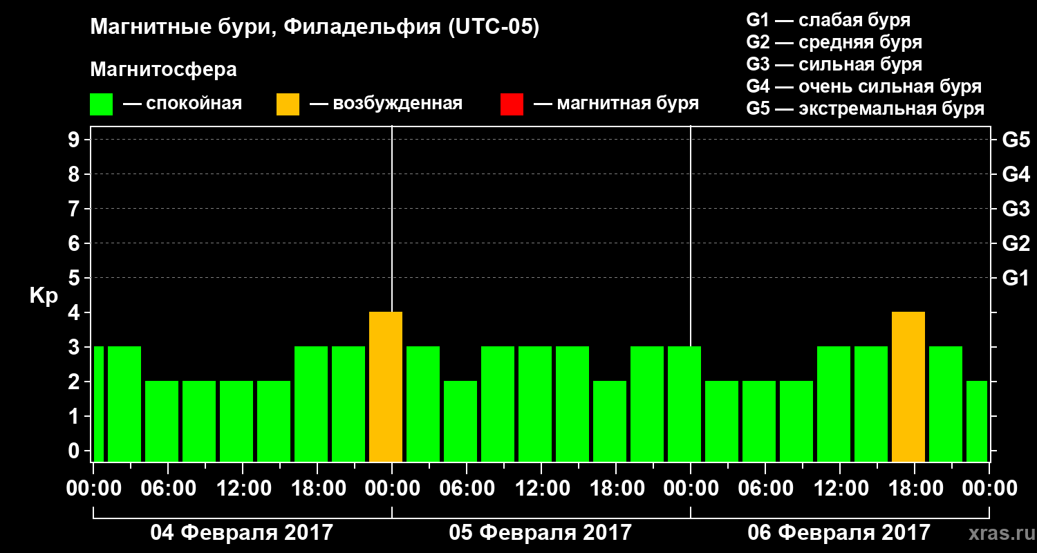 Изменения геомагнитного индекса Kp с 4 по 6 февраля 2017 года для средних широт