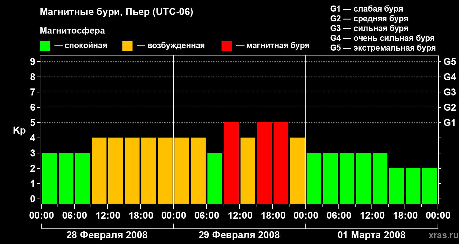 Изменения геомагнитного индекса Kp с 28 февраля по 1 марта 2008 года для средних широт
