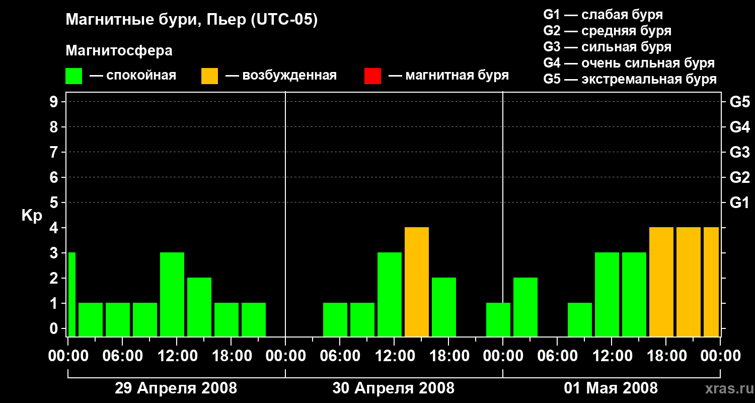 Изменения геомагнитного индекса Kp с 29 апреля по 1 мая 2008 года для средних широт