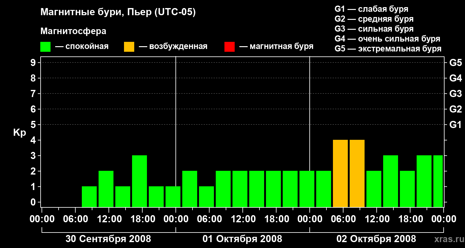 Изменения геомагнитного индекса Kp с 30 сентября по 2 октября 2008 года для средних широт