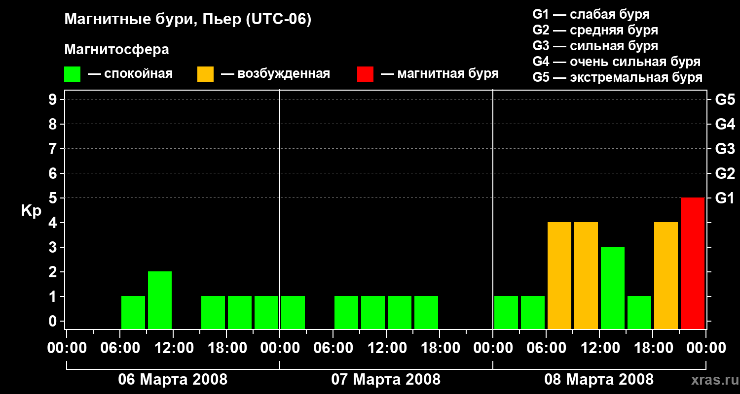 Изменения геомагнитного индекса Kp с 6 по 8 марта 2008 года для средних широт