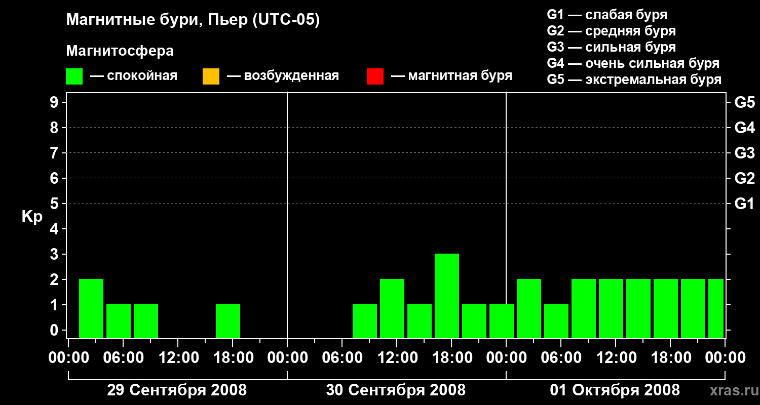 Изменения геомагнитного индекса Kp с 29 сентября по 1 октября 2008 года для средних широт