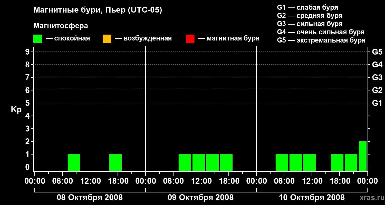 Изменения геомагнитного индекса Kp с 8 по 10 октября 2008 года для средних широт