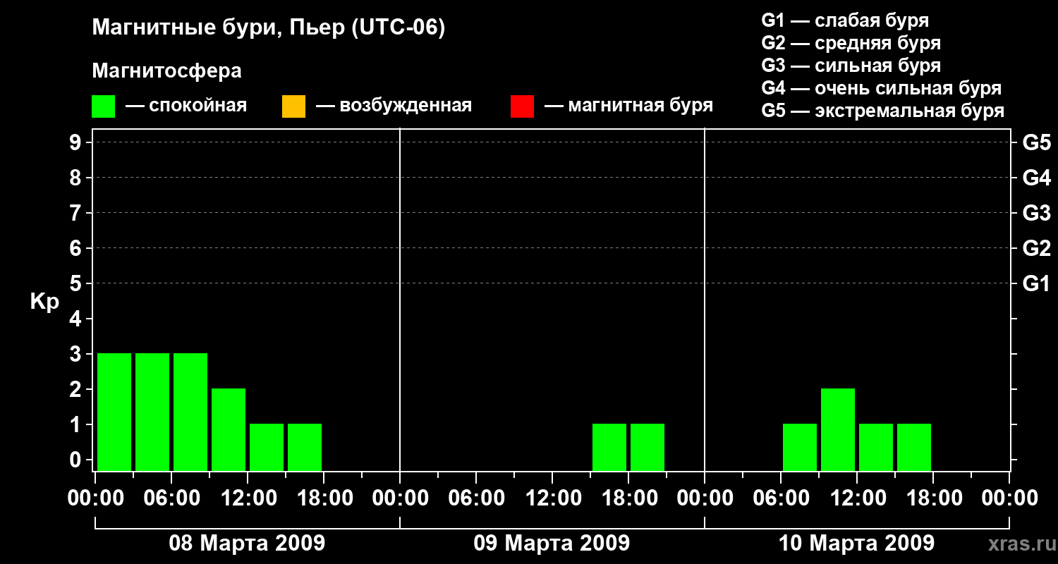 Изменения геомагнитного индекса Kp с 8 по 10 марта 2009 года для средних широт