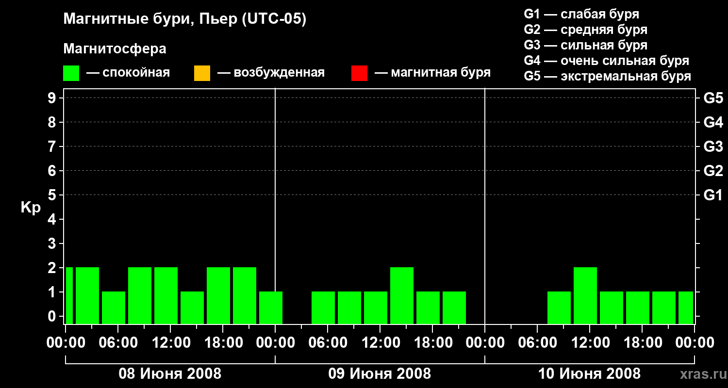 Изменения геомагнитного индекса Kp с 8 по 10 июня 2008 года для средних широт