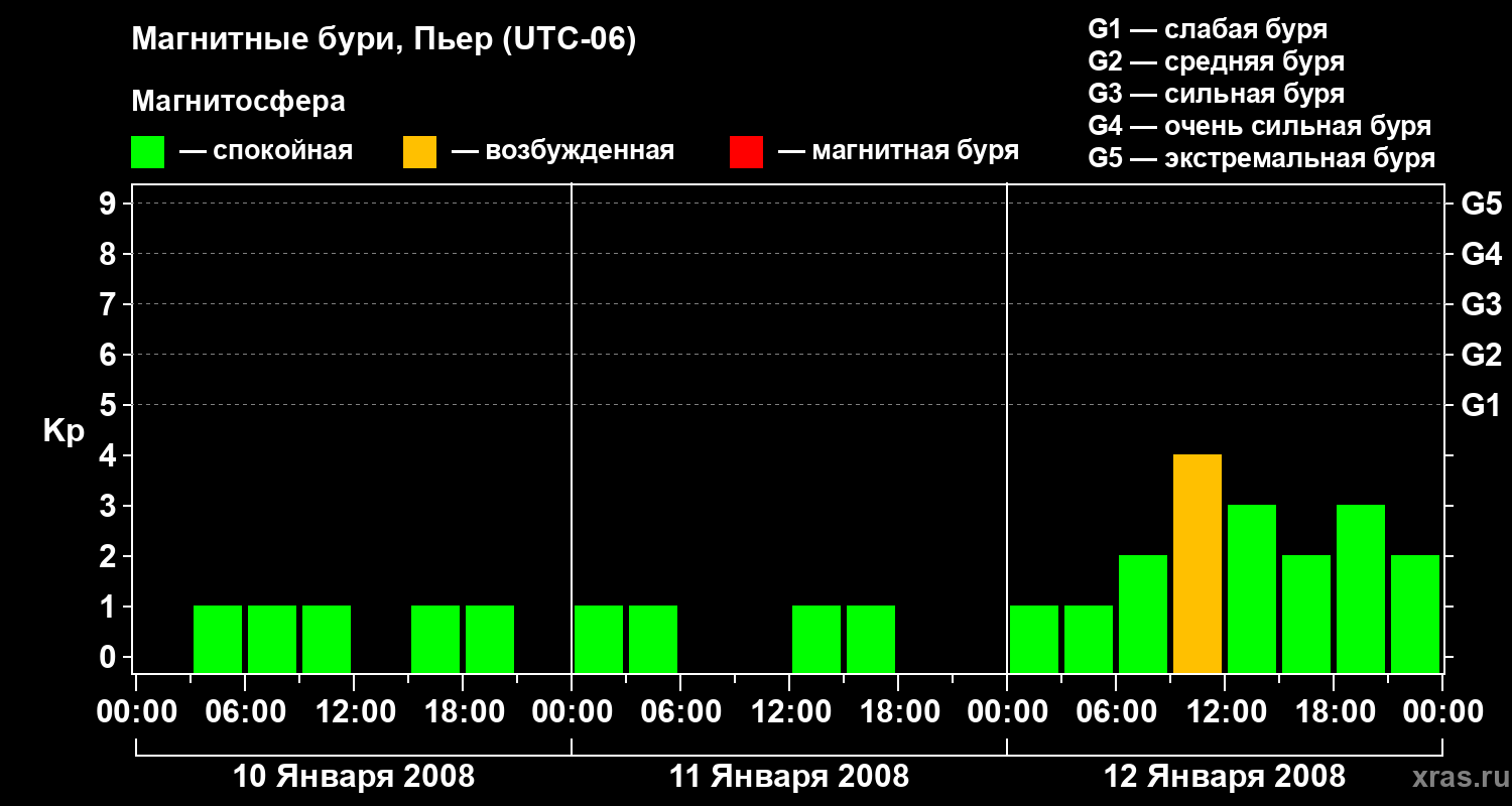 Изменения геомагнитного индекса Kp с 10 по 12 января 2008 года для средних широт