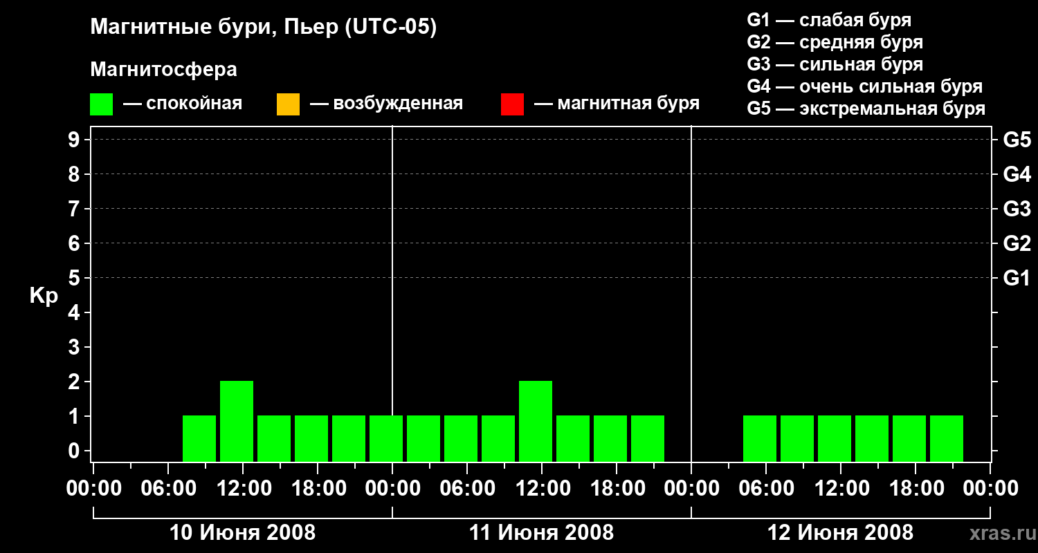 Изменения геомагнитного индекса Kp с 10 по 12 июня 2008 года для средних широт