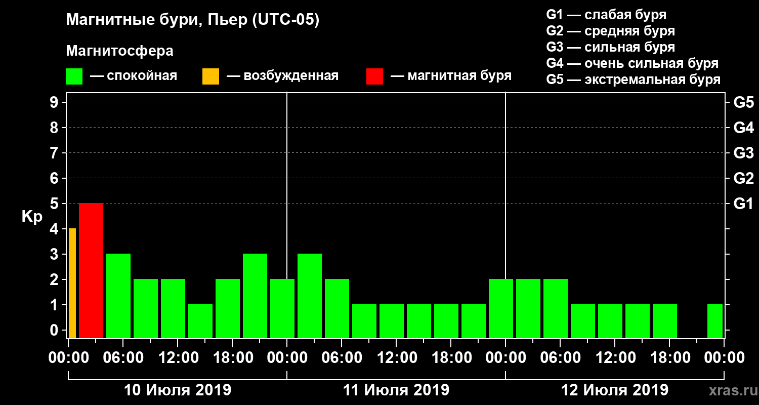 Изменения геомагнитного индекса Kp с 10 по 12 июля 2019 года для средних широт