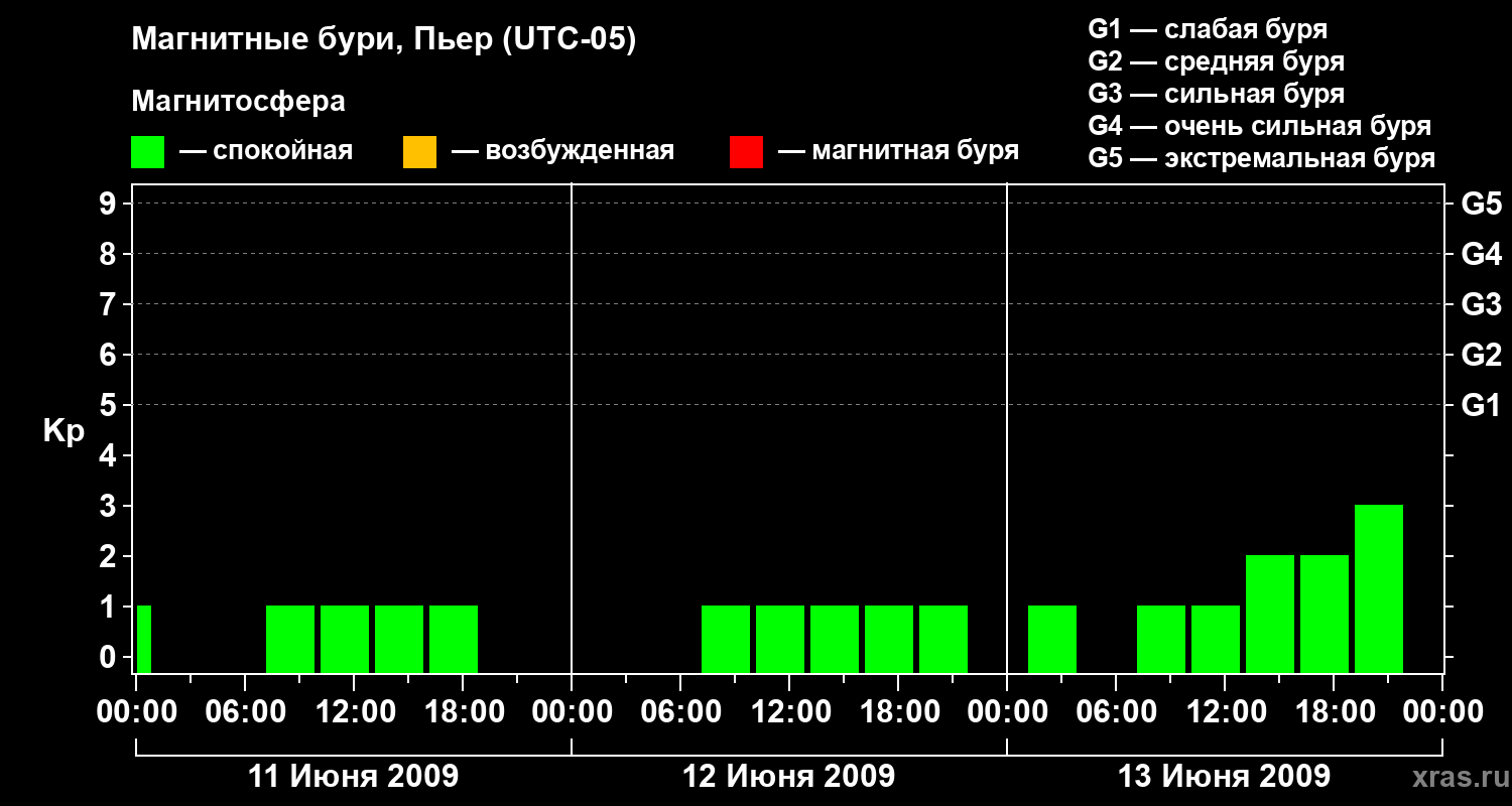 Изменения геомагнитного индекса Kp с 11 по 13 июня 2009 года для средних широт