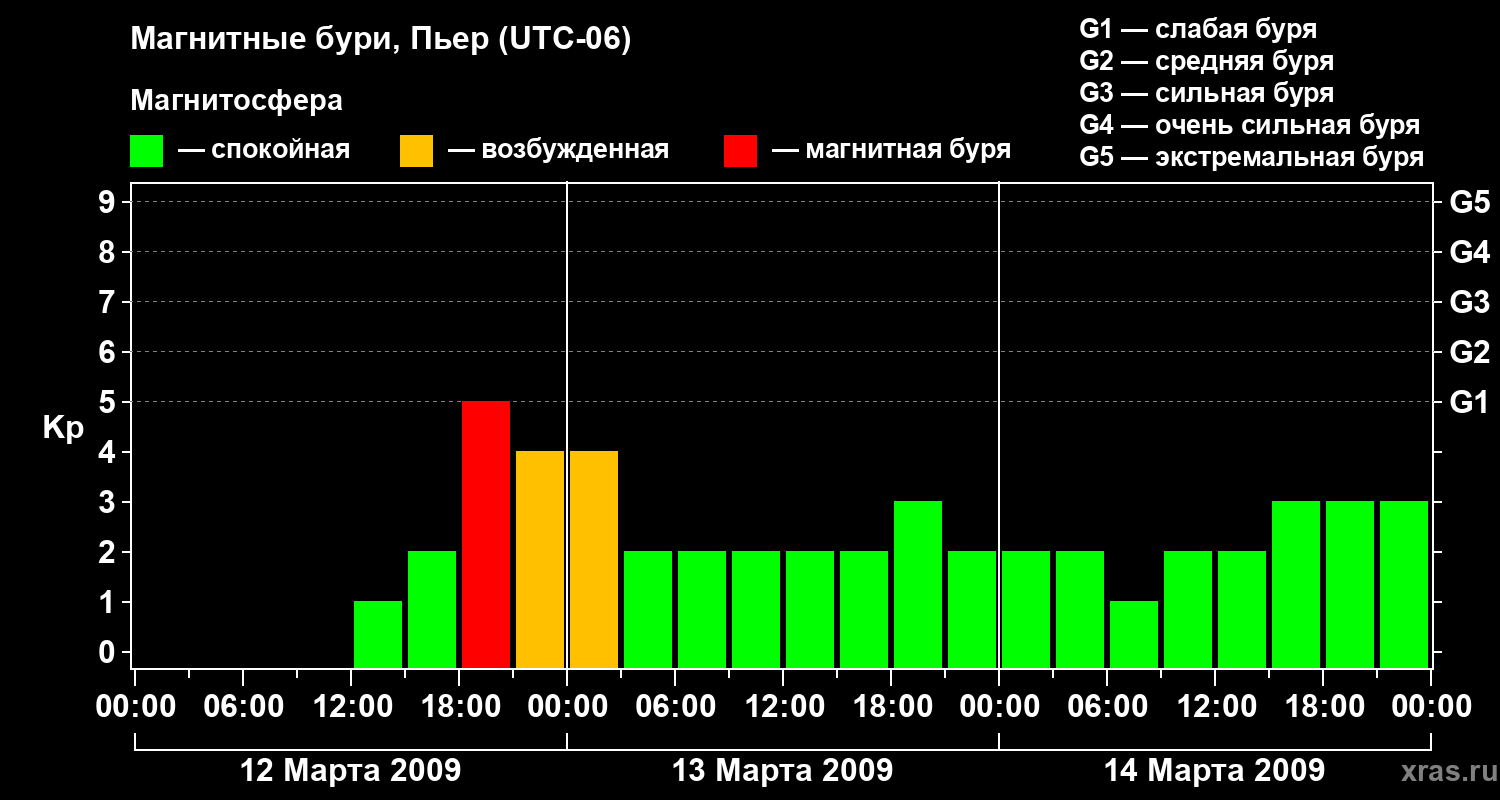 Изменения геомагнитного индекса Kp с 12 по 14 марта 2009 года для средних широт