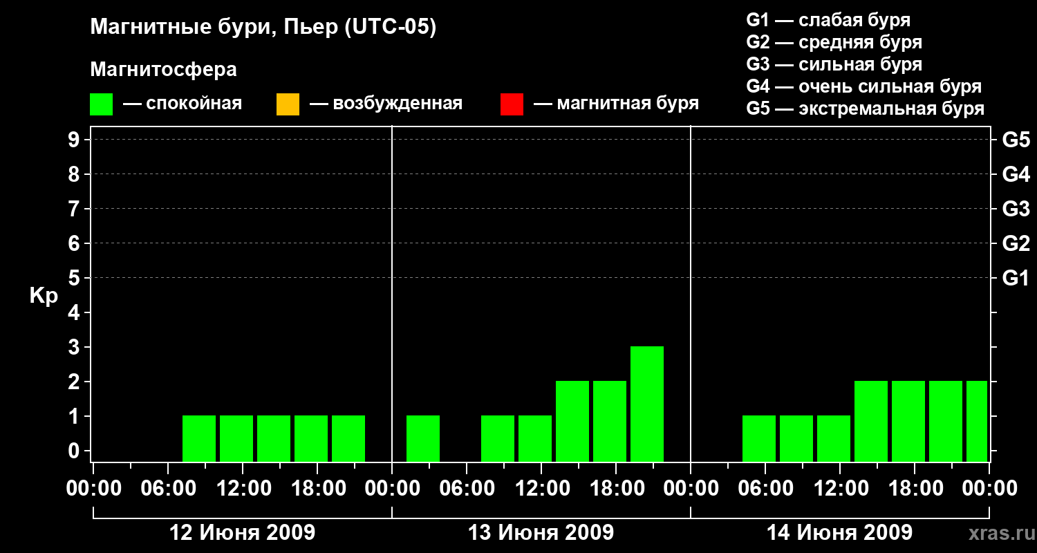 Изменения геомагнитного индекса Kp с 12 по 14 июня 2009 года для средних широт