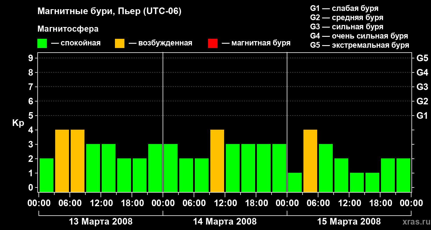 Изменения геомагнитного индекса Kp с 13 по 15 марта 2008 года для средних широт