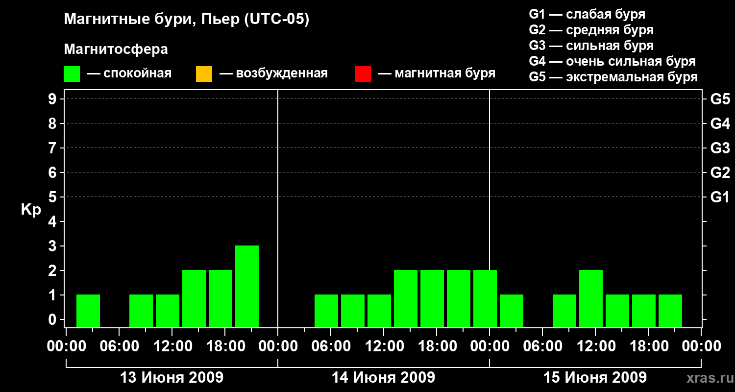 Изменения геомагнитного индекса Kp с 13 по 15 июня 2009 года для средних широт
