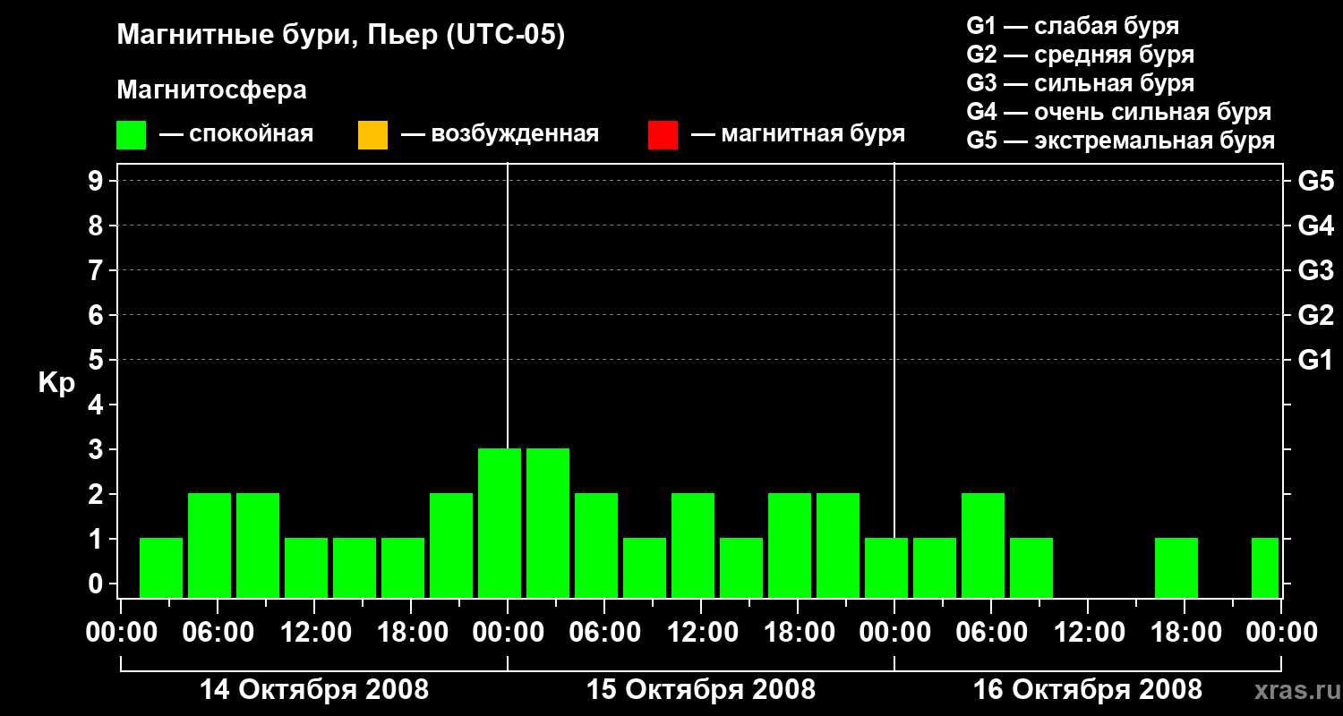 Изменения геомагнитного индекса Kp с 14 по 16 октября 2008 года для средних широт