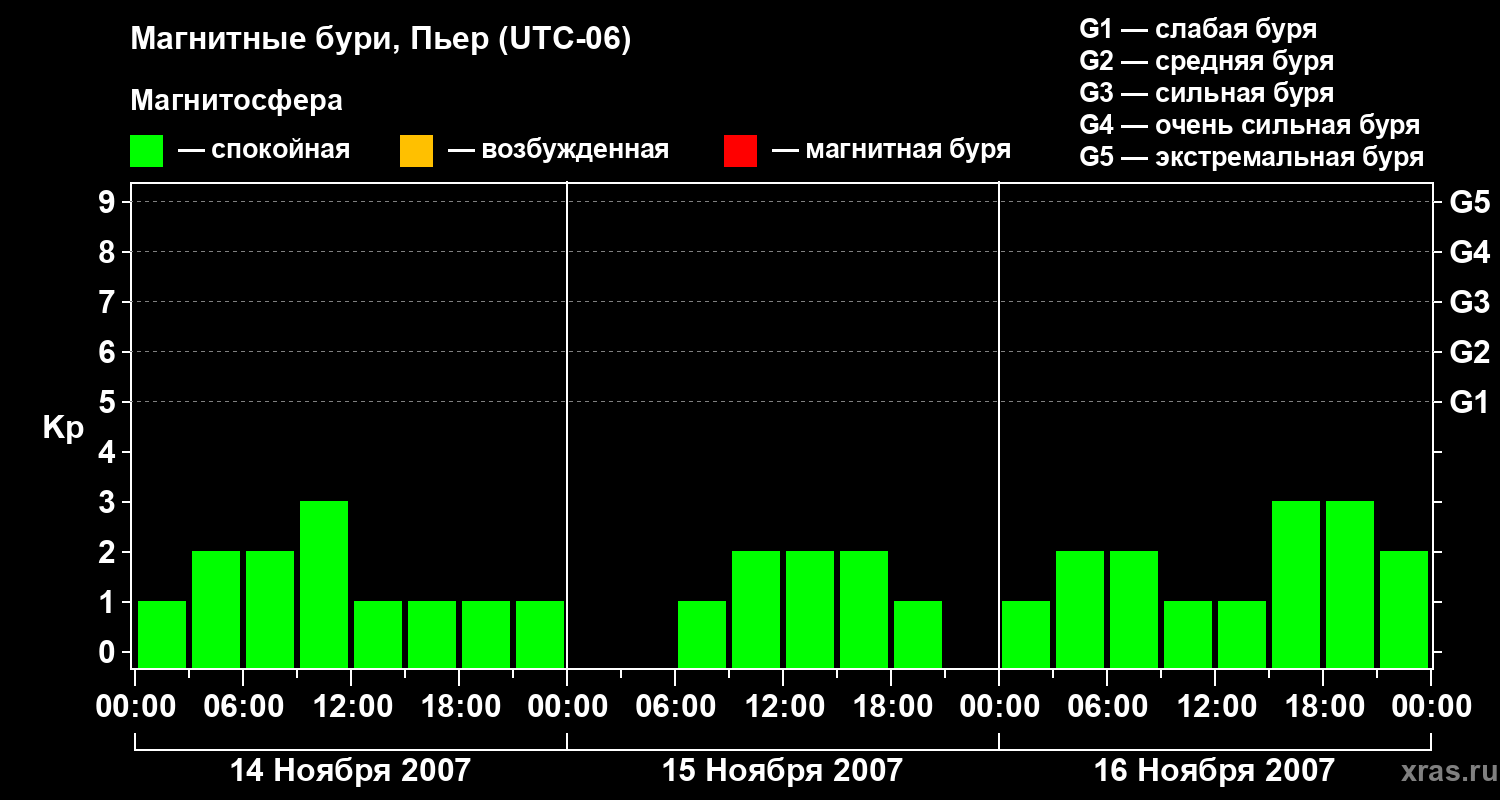 Изменения геомагнитного индекса Kp с 14 по 16 ноября 2007 года для средних широт