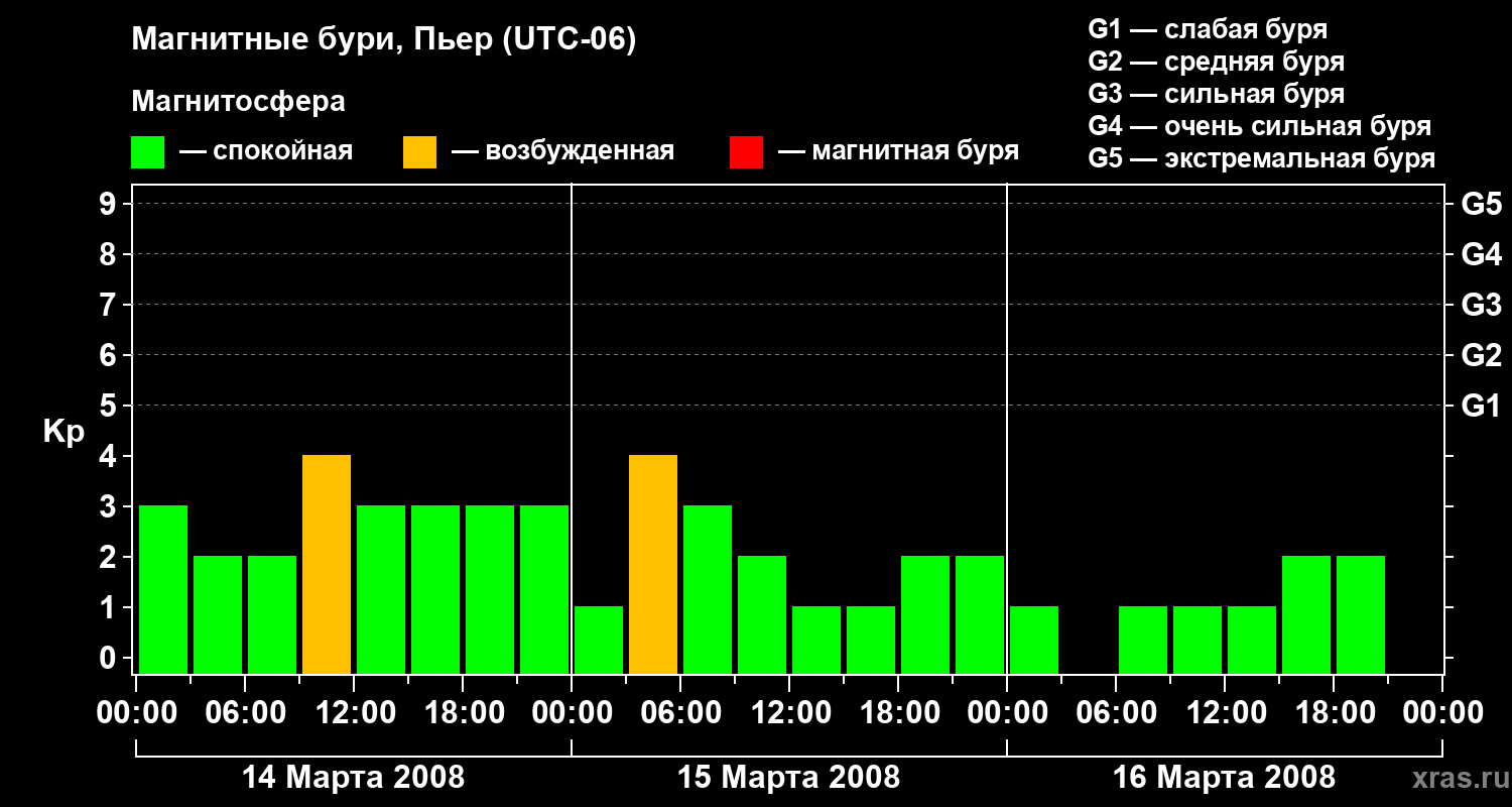 Изменения геомагнитного индекса Kp с 14 по 16 марта 2008 года для средних широт