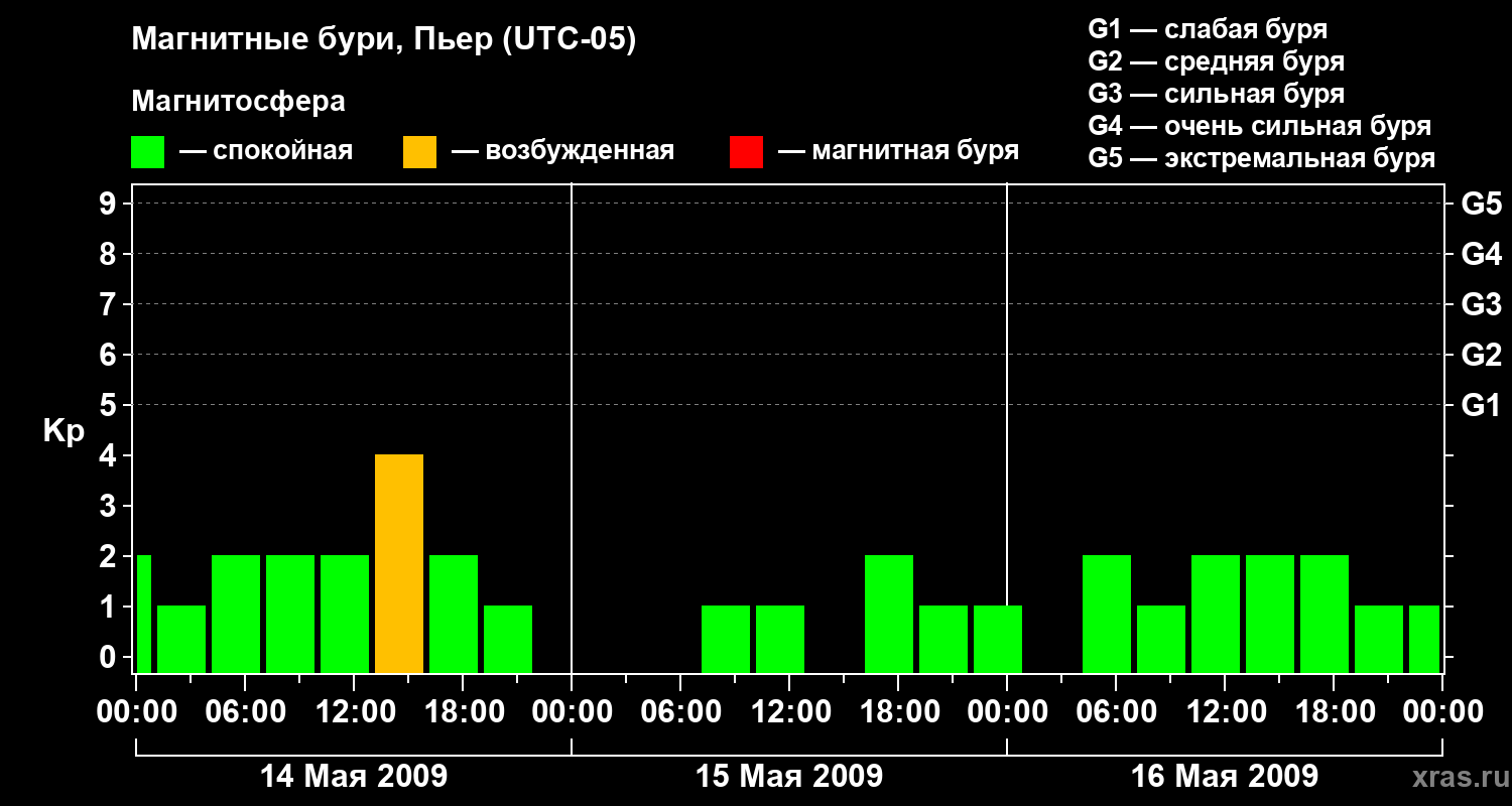 Изменения геомагнитного индекса Kp с 14 по 16 мая 2009 года для средних широт