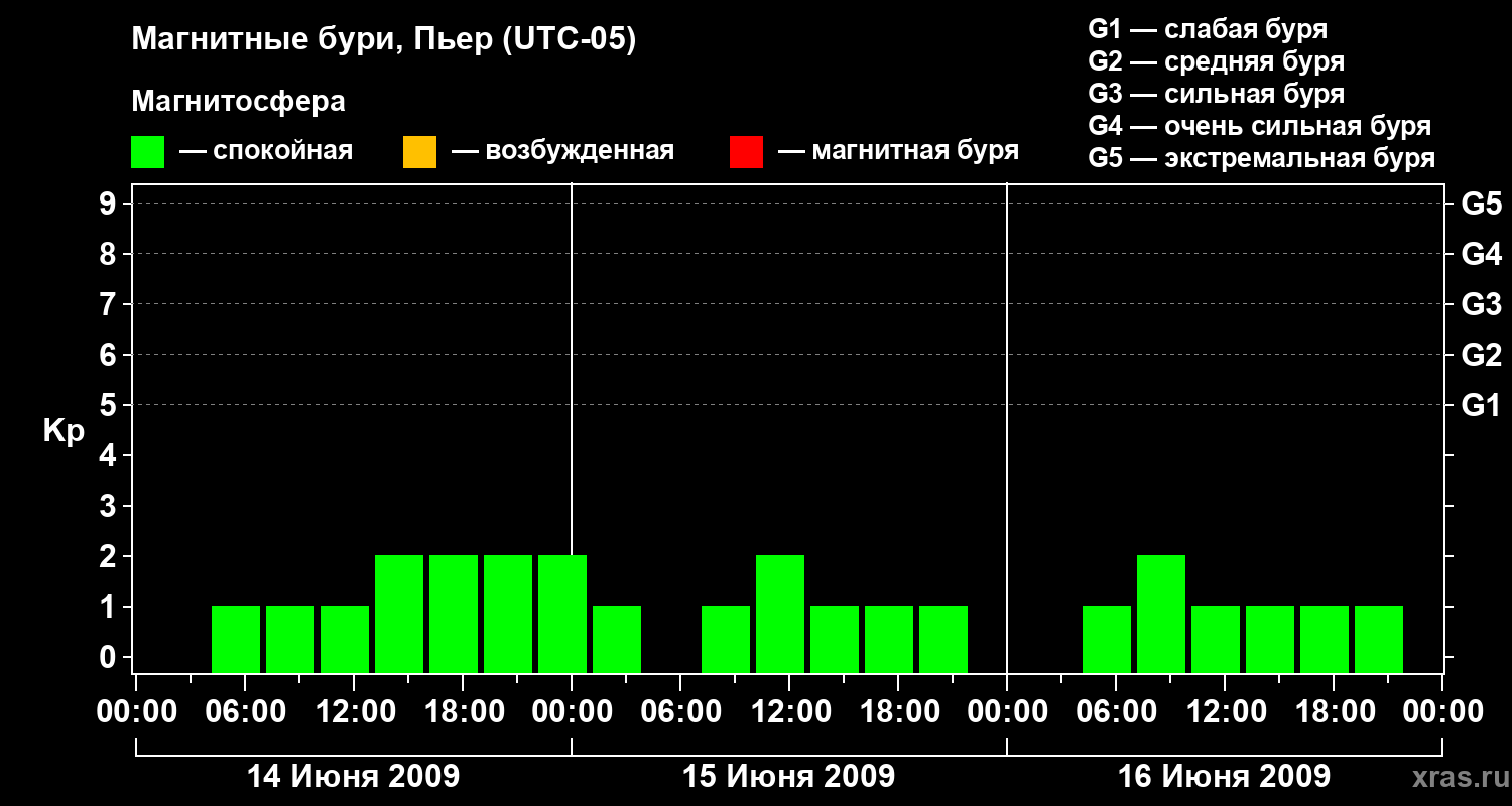 Изменения геомагнитного индекса Kp с 14 по 16 июня 2009 года для средних широт