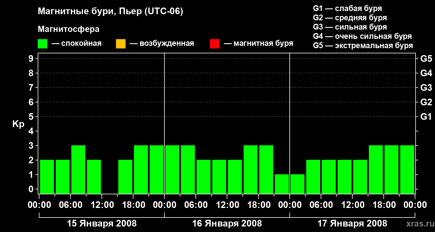 Изменения геомагнитного индекса Kp с 15 по 17 января 2008 года для средних широт