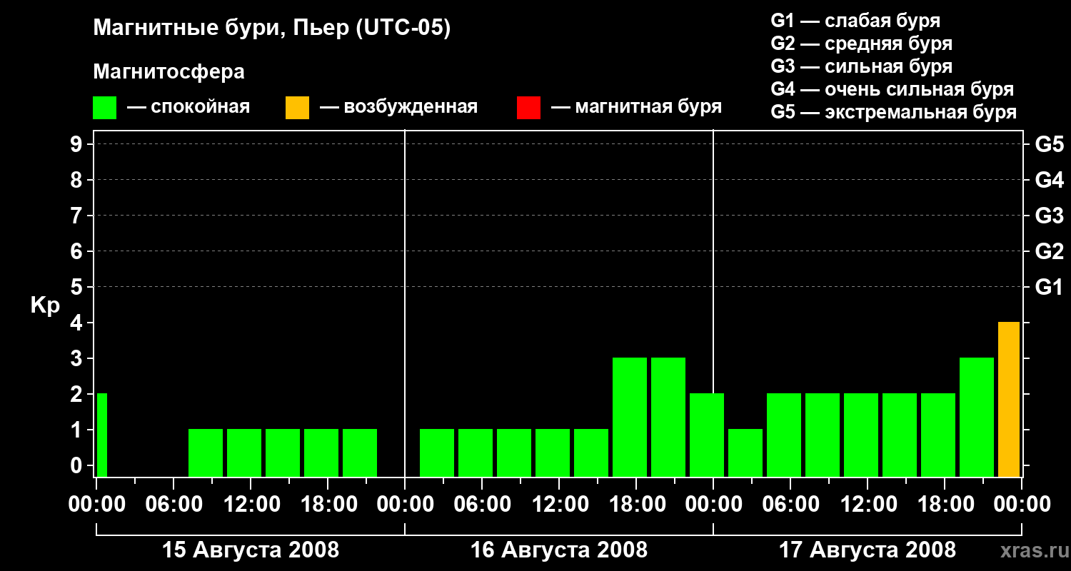 Изменения геомагнитного индекса Kp с 15 по 17 августа 2008 года для средних широт