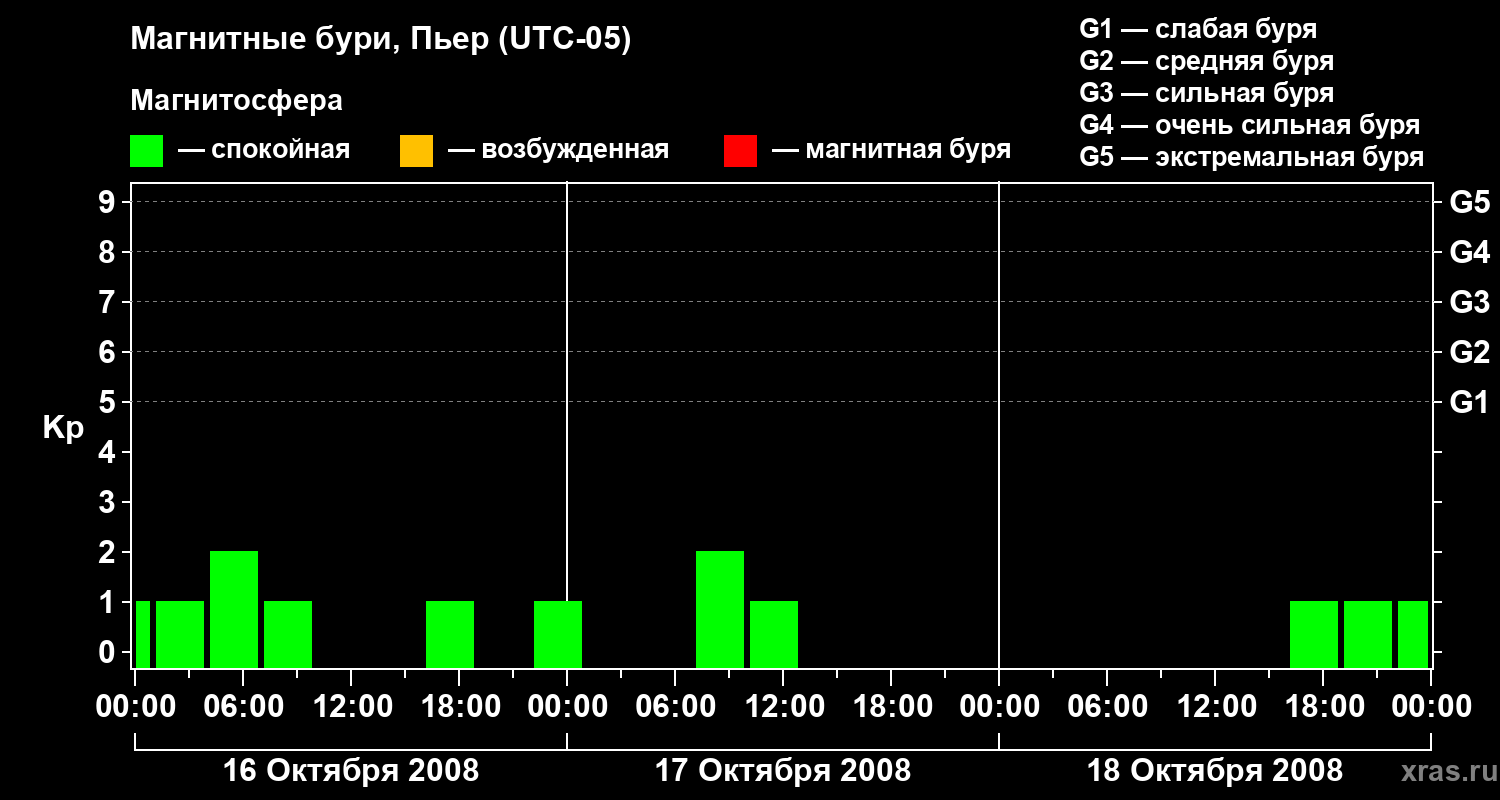 Изменения геомагнитного индекса Kp с 16 по 18 октября 2008 года для средних широт