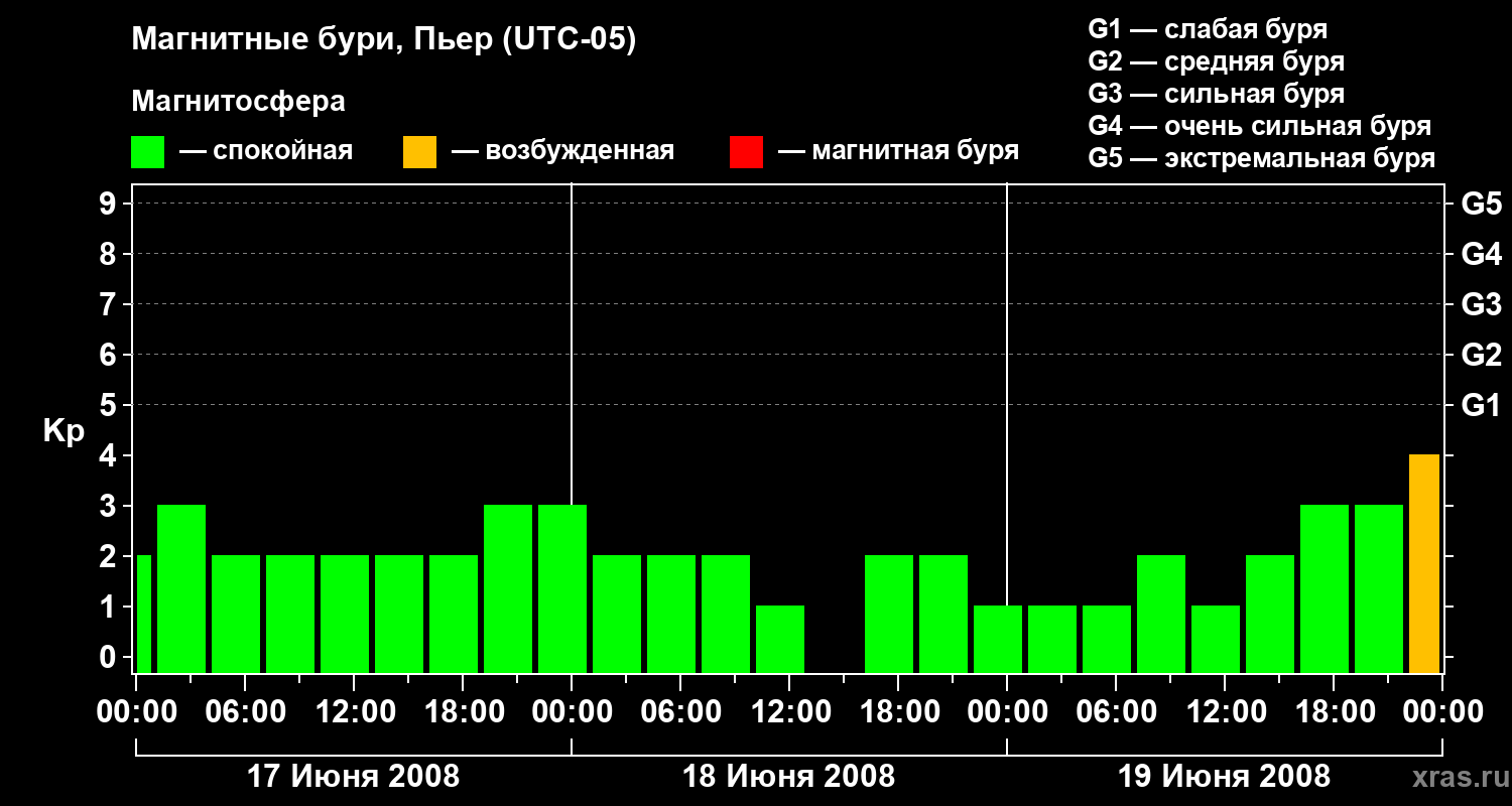 Изменения геомагнитного индекса Kp с 17 по 19 июня 2008 года для средних широт
