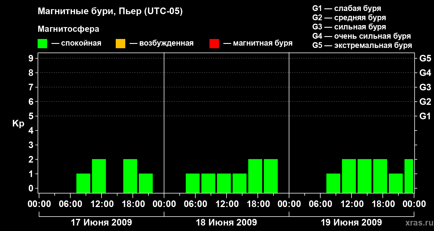 Изменения геомагнитного индекса Kp с 17 по 19 июня 2009 года для средних широт