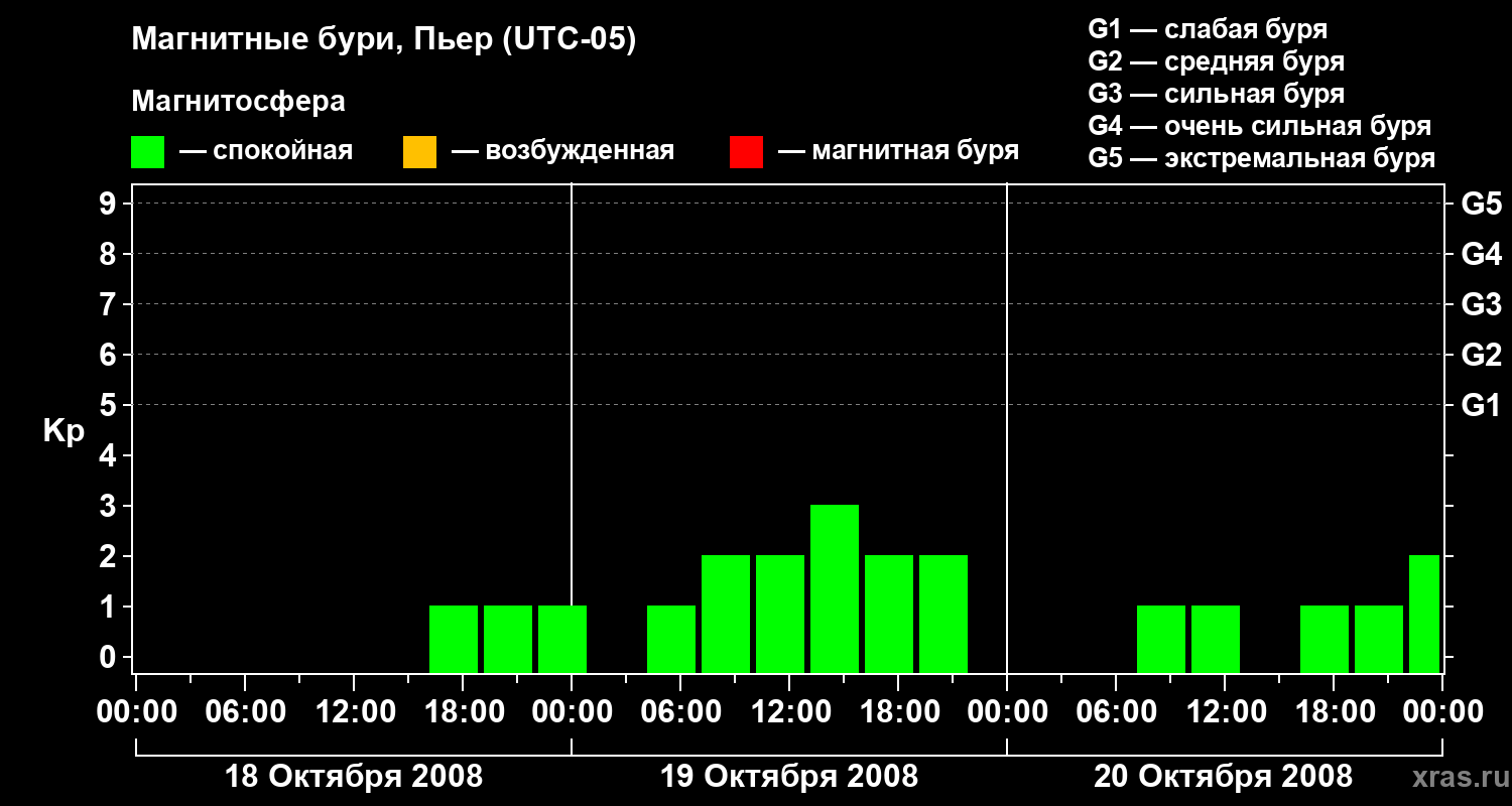 Изменения геомагнитного индекса Kp с 18 по 20 октября 2008 года для средних широт