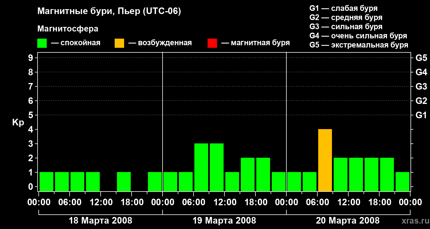 Изменения геомагнитного индекса Kp с 18 по 20 марта 2008 года для средних широт