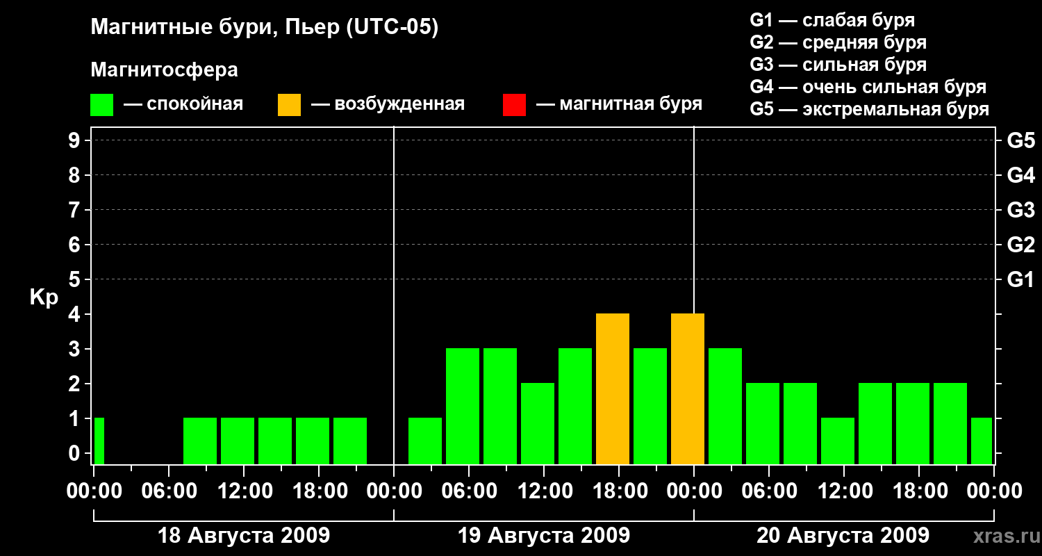 Изменения геомагнитного индекса Kp с 18 по 20 августа 2009 года для средних широт