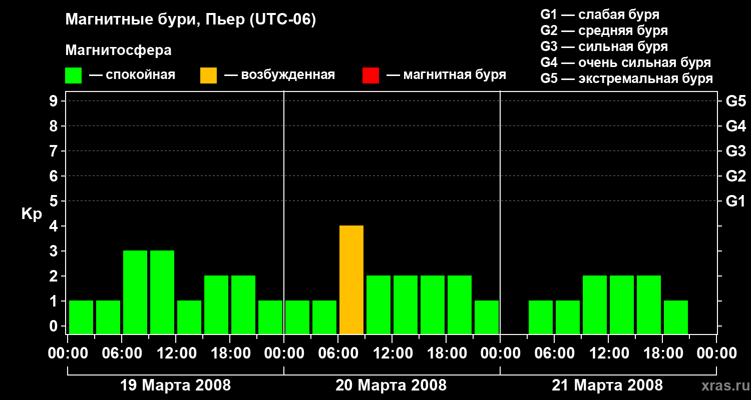 Изменения геомагнитного индекса Kp с 19 по 21 марта 2008 года для средних широт