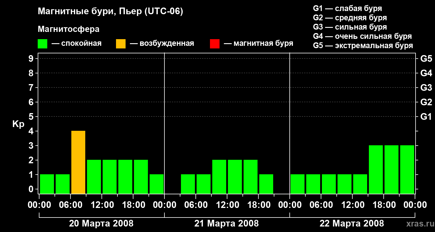 Изменения геомагнитного индекса Kp с 20 по 22 марта 2008 года для средних широт