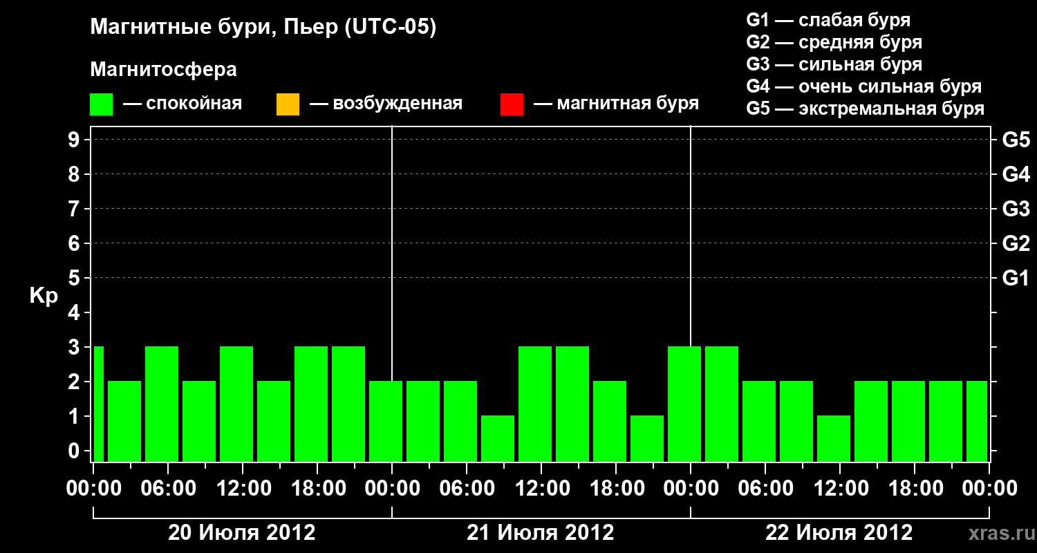 Изменения геомагнитного индекса Kp с 20 по 22 июля 2012 года для средних широт
