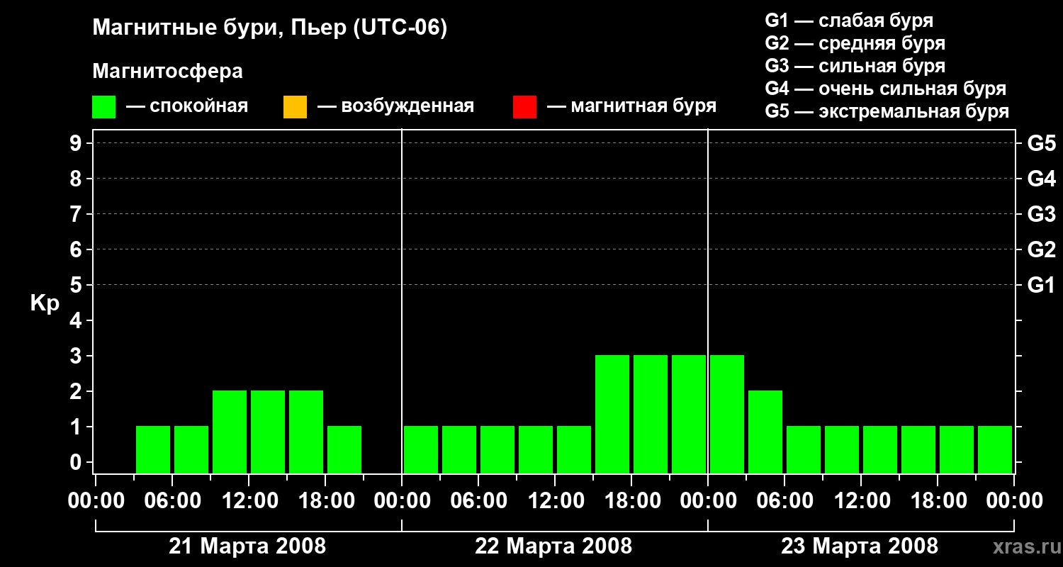 Изменения геомагнитного индекса Kp с 21 по 23 марта 2008 года для средних широт