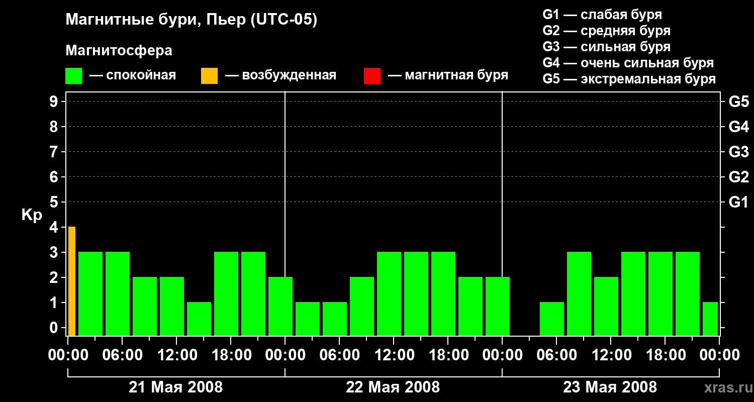 Изменения геомагнитного индекса Kp с 21 по 23 мая 2008 года для средних широт