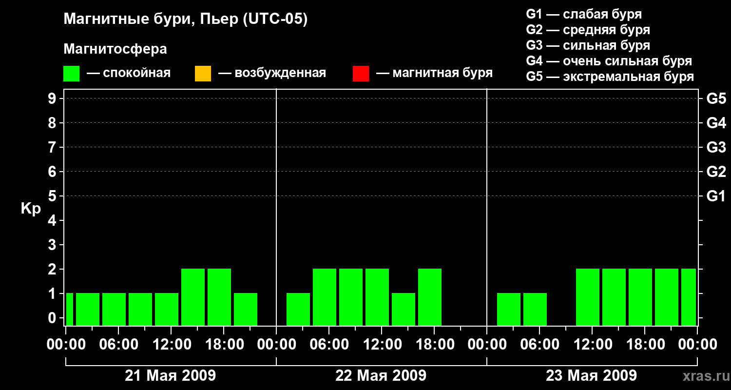 Изменения геомагнитного индекса Kp с 21 по 23 мая 2009 года для средних широт