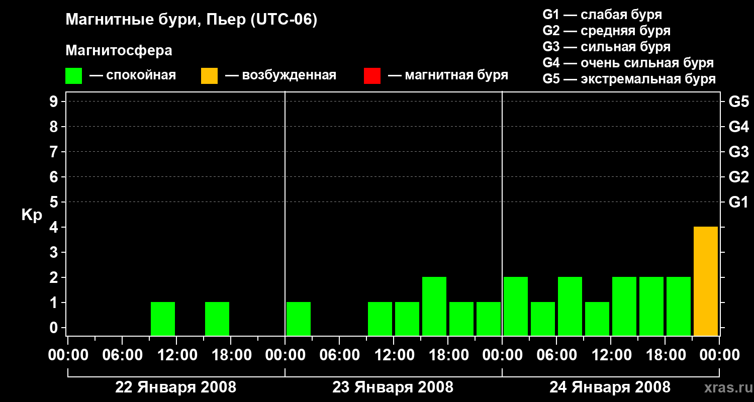 Изменения геомагнитного индекса Kp с 22 по 24 января 2008 года для средних широт