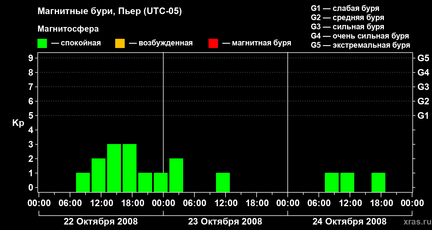 Изменения геомагнитного индекса Kp с 22 по 24 октября 2008 года для средних широт