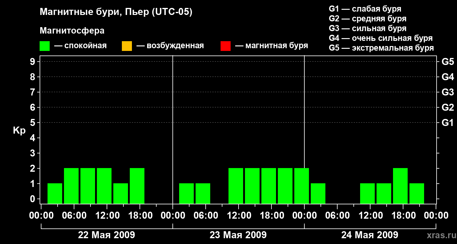 Изменения геомагнитного индекса Kp с 22 по 24 мая 2009 года для средних широт
