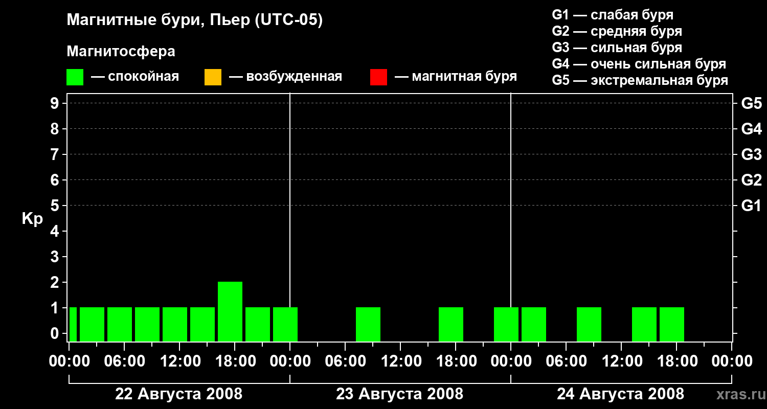 Изменения геомагнитного индекса Kp с 22 по 24 августа 2008 года для средних широт