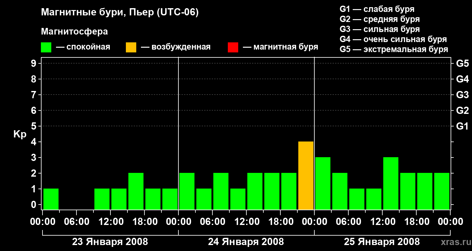 Изменения геомагнитного индекса Kp с 23 по 25 января 2008 года для средних широт