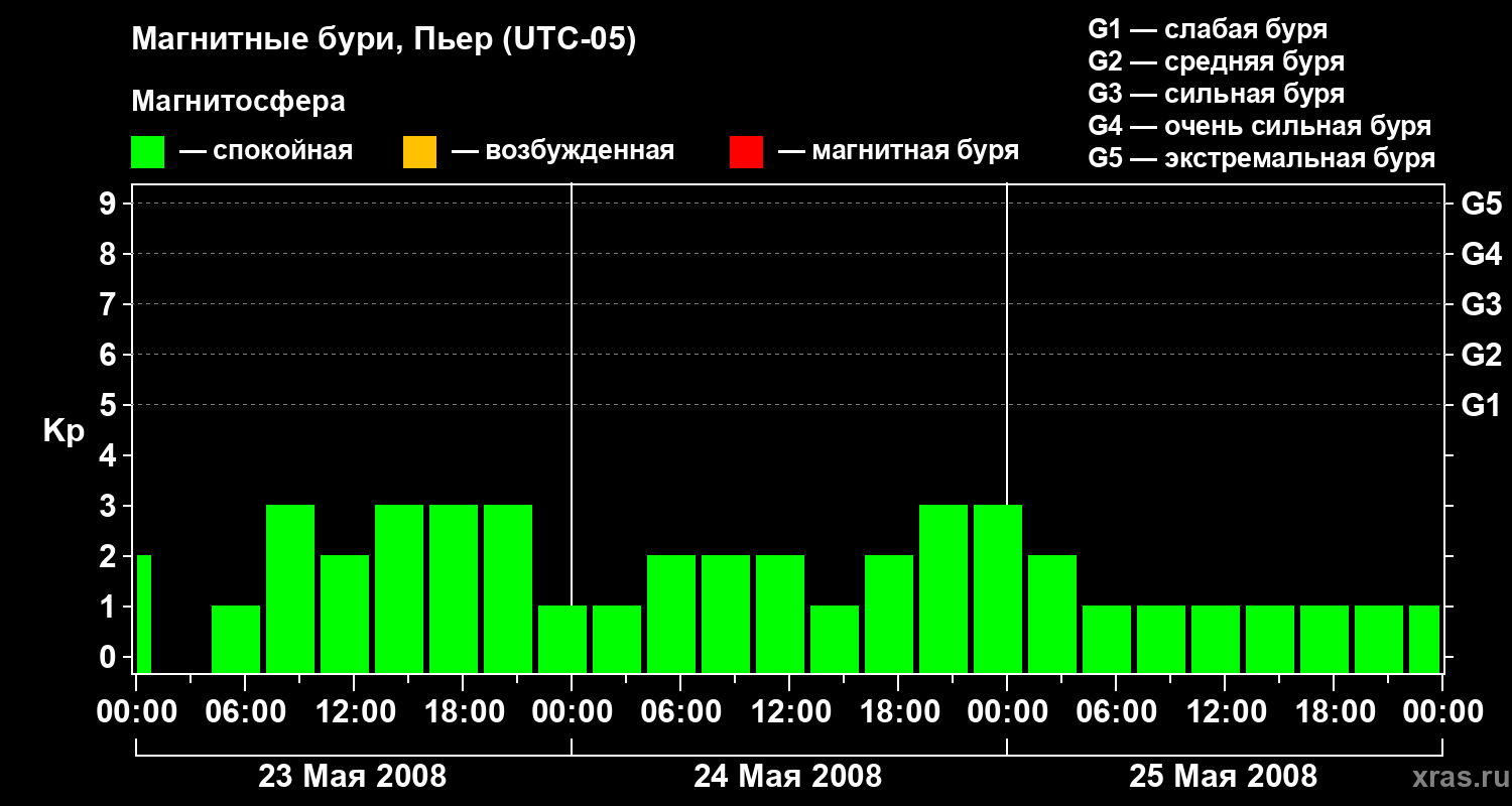 Изменения геомагнитного индекса Kp с 23 по 25 мая 2008 года для средних широт