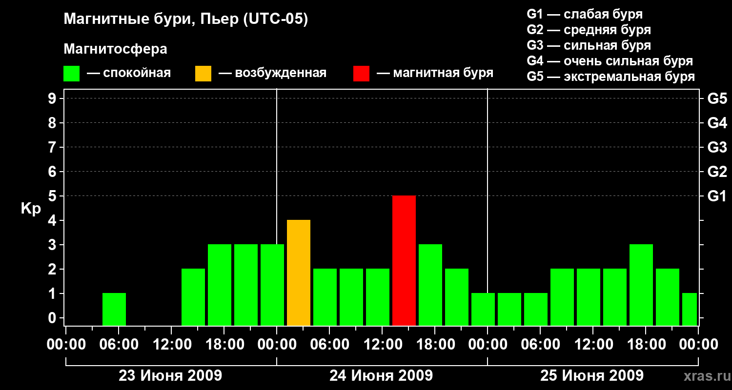 Изменения геомагнитного индекса Kp с 23 по 25 июня 2009 года для средних широт