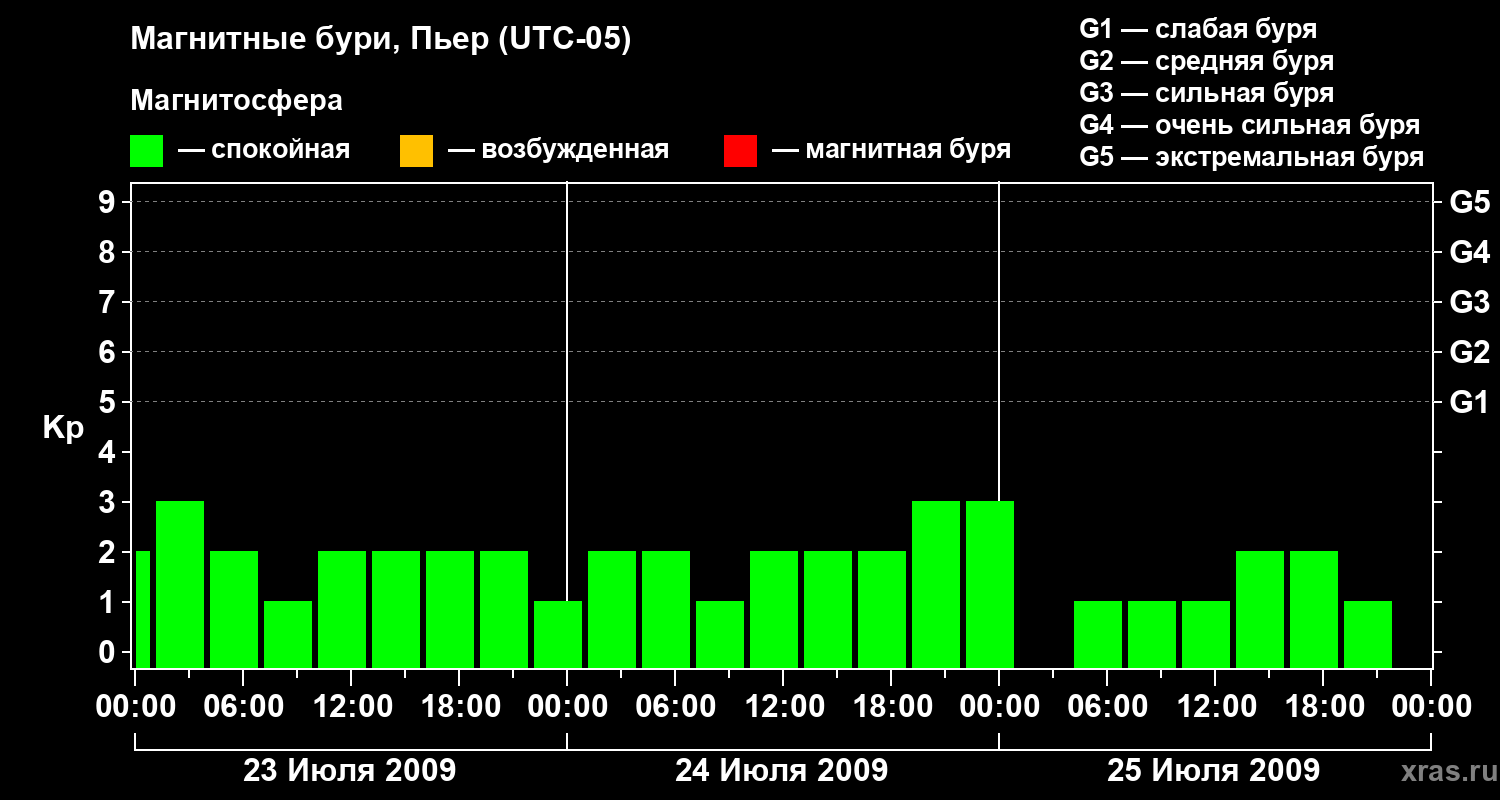 Изменения геомагнитного индекса Kp с 23 по 25 июля 2009 года для средних широт