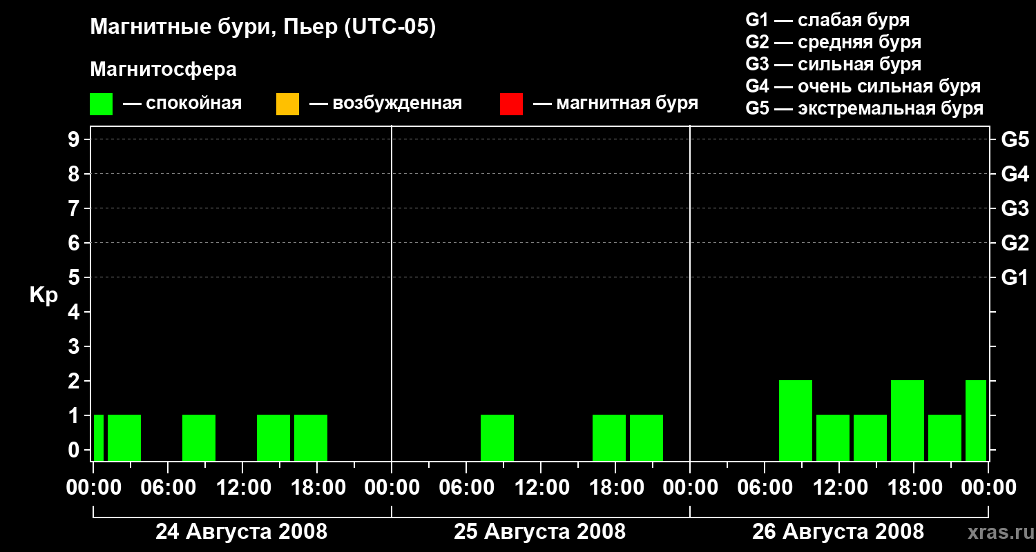 Изменения геомагнитного индекса Kp с 24 по 26 августа 2008 года для средних широт