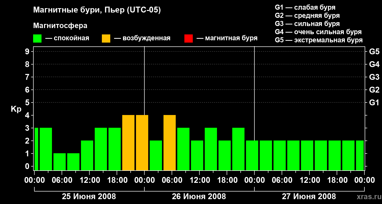 Изменения геомагнитного индекса Kp с 25 по 27 июня 2008 года для средних широт