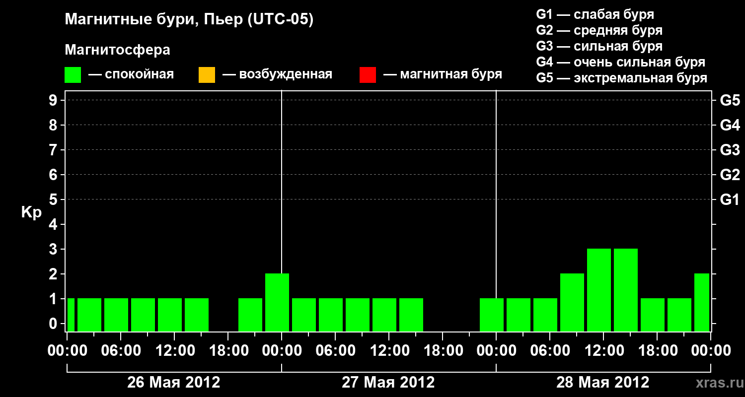 Изменения геомагнитного индекса Kp с 26 по 28 мая 2012 года для средних широт
