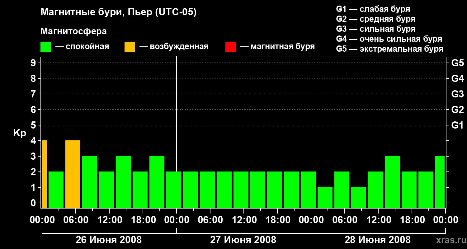 Изменения геомагнитного индекса Kp с 26 по 28 июня 2008 года для средних широт